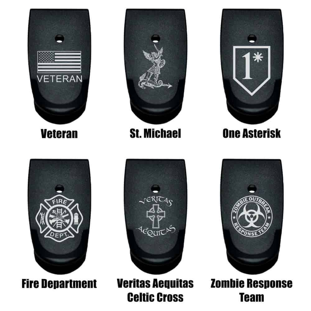 This article will focus primarily on magazine base plate extensions and slide back plates for a Smith & Wesson M&P Shield 2.0. Each part is CNC-machined from T6 aluminum and then hard anodized black. The American Flag design you see on the plates is laser-etched, which means it will never wear off or peel, unlike paint and stickers. The metal itself is literally burned away to create highly detailed and precise patterns that will last a lifetime.