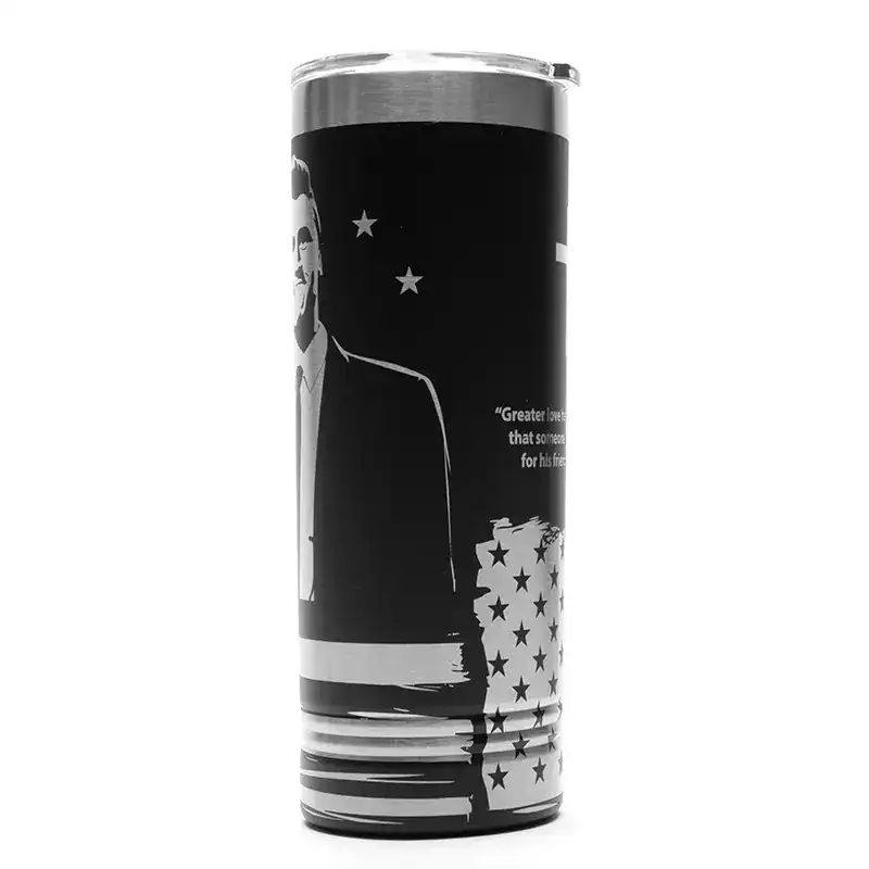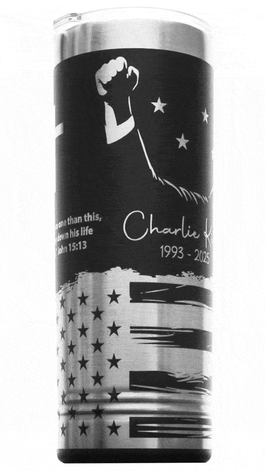 Charlie’s death has deeply impacted us, and we want to do everything we can to help keep his legacy alive and well. A portion of the proceeds from each sale of these memorial tumblers will be donated to Turning Point USA. The optional add-on “FREEDOM” keychain features a rippling background behind the word, symbolizing the famous quote from Marcus Aralous, “What we do in life echoes in eternity.”