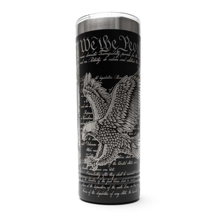 Introducing the “Liberty’s Vision” Tumbler – a vessel that embodies the spirit of the American dream. This 22oz tumbler boasts an intricate full 360-degree wrap design featuring a commanding bald eagle in flight, the revered stripes of a vertical American flag, and the immortalized words of the United States Constitution. Each detail has been laser-etched onto the surface, creating a tactile and visually stunning representation of freedom and the rule of law that define the nation.