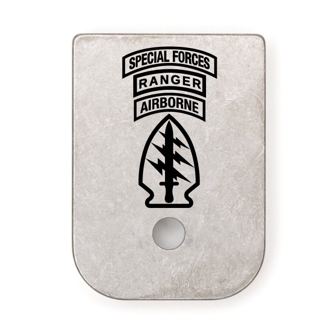 Custom US Army Special Forces Triple Canopy Patch Laser Engraved Magazine Baseplate – Fits Full-Size & Slimline Glock Pistols – Anodized Aluminum, Titanium, or Brass