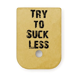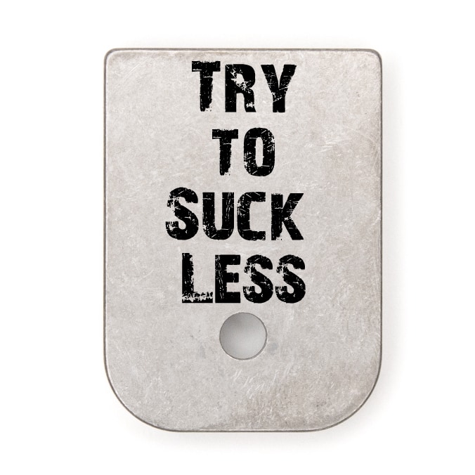 Custom TRY TO SUCK LESS Grunge Text Laser Engraved Magazine Baseplate – Fits Full-Size & Slimline Glock Pistols – Anodized Aluminum, Titanium, or Brass